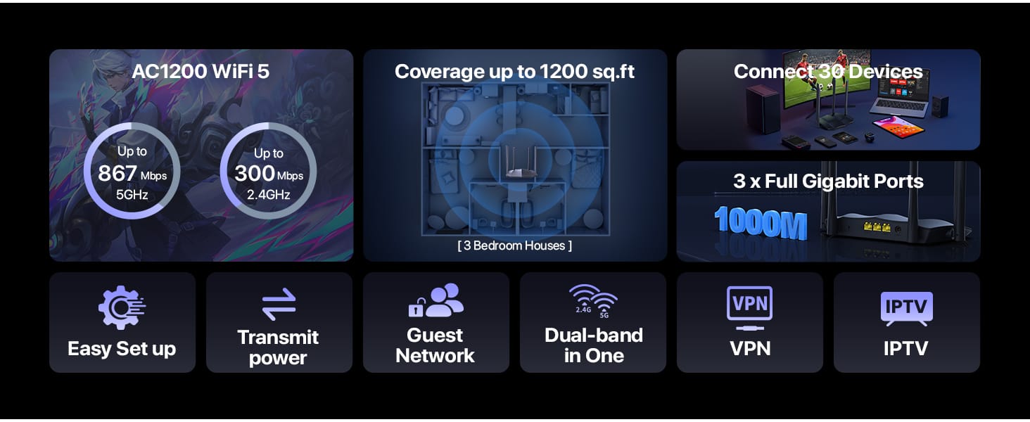 - 𝐀𝐂𝟏𝟐𝟎𝟎 𝐃𝐮𝐚𝐥-𝐁𝐚𝐧𝐝 𝐖𝐢𝐅𝐢 𝐑𝐨𝐮𝐭𝐞𝐫 𝐟𝐨𝐫 𝐇𝐨𝐦𝐞 — Ideal for gaming, 4K streaming, downloading and more with Wi-Fi speeds up to 1.2 Gbps (867 Mbps on 5 GHz band and 300 Mbps on 2.4 GHz band)