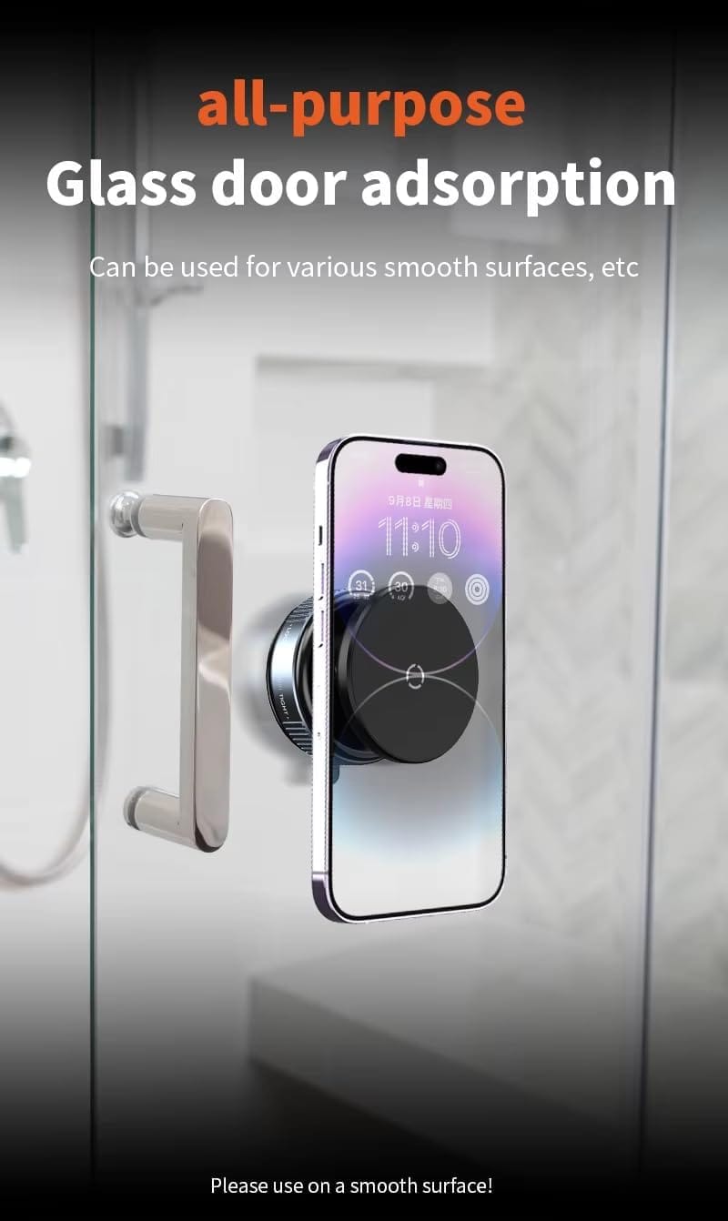 Mbajtësja magnetike e telefonit me vakum, teknologji e avancuar e thithjes me vakum, që lejon funksionimin pa duar në sipërfaqe të ndryshme të lëmuara. Thjesht shtyjeni dhe do të thithet. Lëshoni presionin me një buton dhe mund ta përballoni lehtësisht