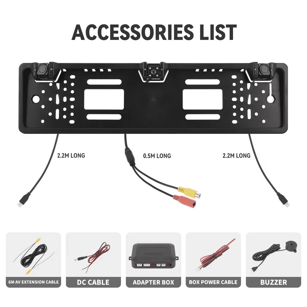 Kjo mbajtëse targash e fortë plastike me cilësi të lartë përmban dy sensorë në anët e mbajtësit të targës dhe një kamerë në mes.