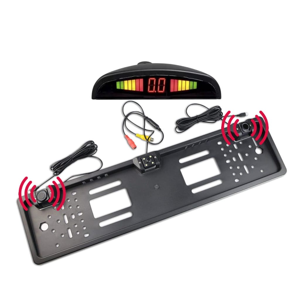 Mbajtëse e targave me kamerë mbrapa dhe sensorë PDC për pjesën e pasme në të zezë – Ideale për montimin e një aparati ndihmës parkimi – me zë – 2 sensorë të rregullueshëm