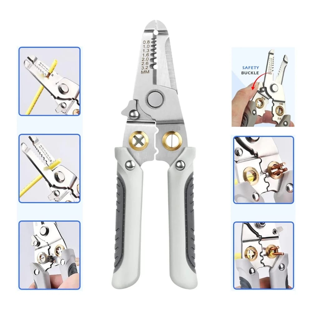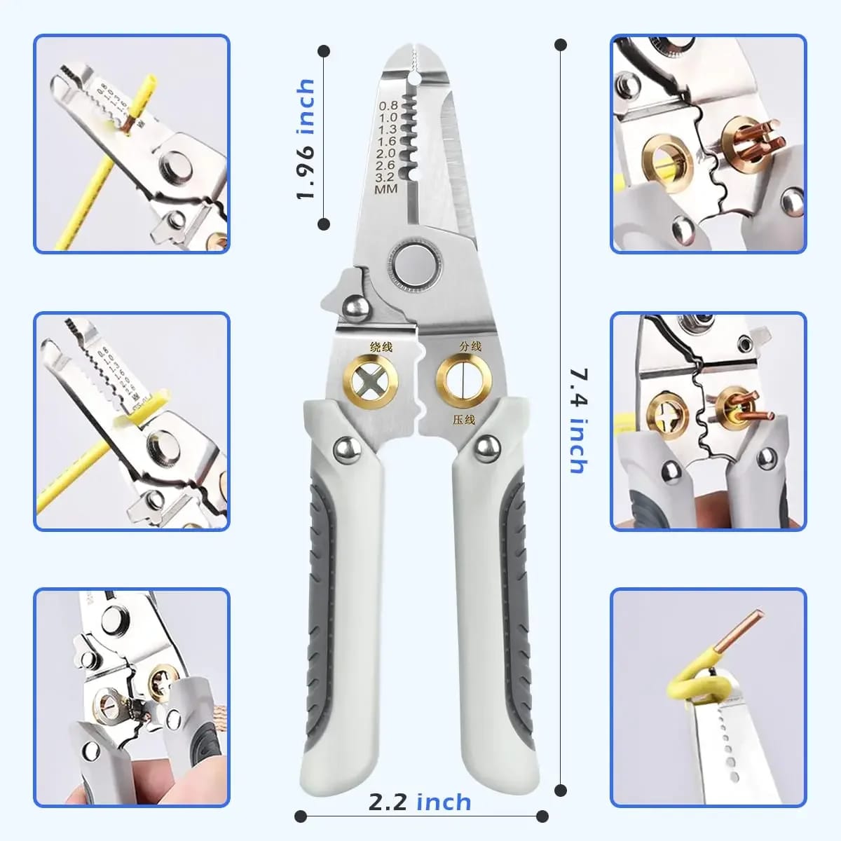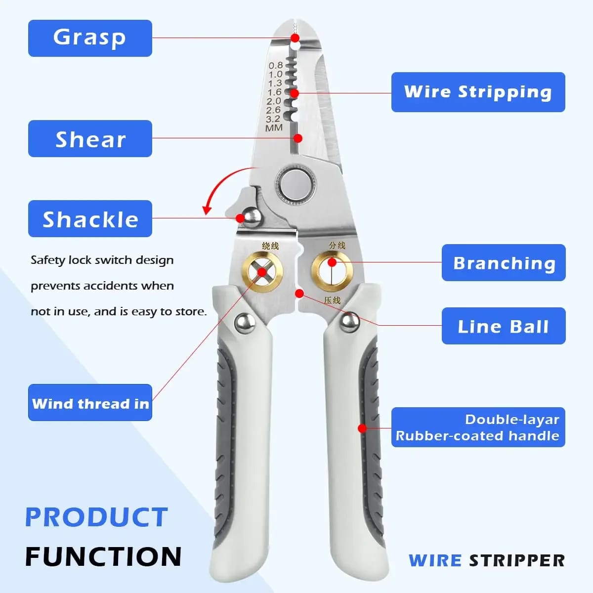 Pincë zhveshëse telash shumëfunksionale 6 në 1 prej çeliku të aliazhuar me cilësi të lartë, pas trajtimit të përgjithshëm termik, fortësi të lartë, sipërfaqe të lëmuar, përdorimi afatgjatë nuk do të ndryshket. Kjo pincë për zhveshjen e telit është e fuqishme